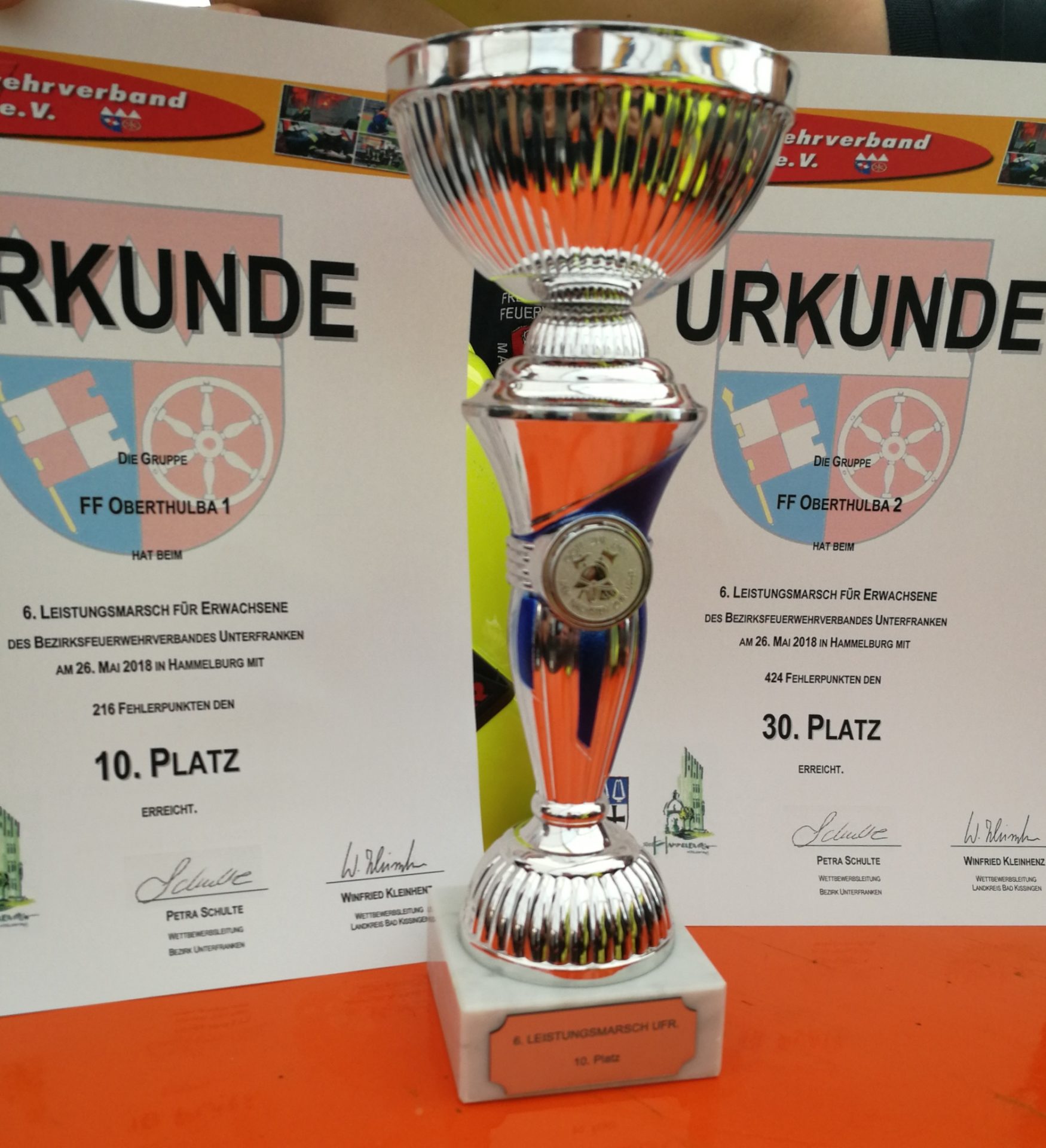 Im Rahmen ihres 160-jährigem Jubiläum richtete die Freiwillige Feuerwehr Hammelburg in diesem Jahr den 6. Unterfränkischen Leistungsmarsch aus. Rund 200 Teilnehmer und Teilnehmerinnen aus Ober-, Mittel- und Unterfranken stellten bei diesem Wettbewerb ihr Können unter Beweis. Die Freiwillige Feuerwehr Oberthulba, welche zuletzt im Jahr 2008 an einem Leistungsmarsch teilnahm, stellte zwei Gruppen mit jeweils vier Feuerwehrkameraden die zum Start am sonnig, warmen Samstag in Hammelburg antraten.